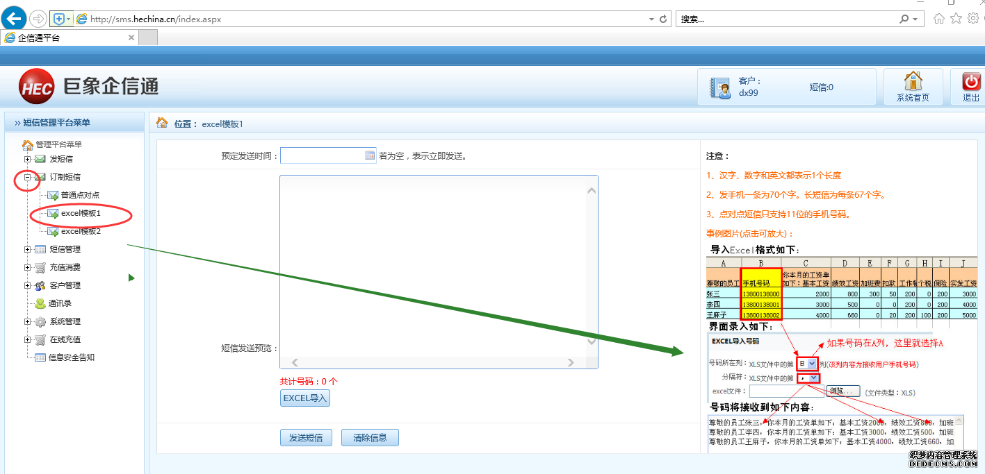 下面详细介绍怎样使用巨象企信通平台批量发送短信: