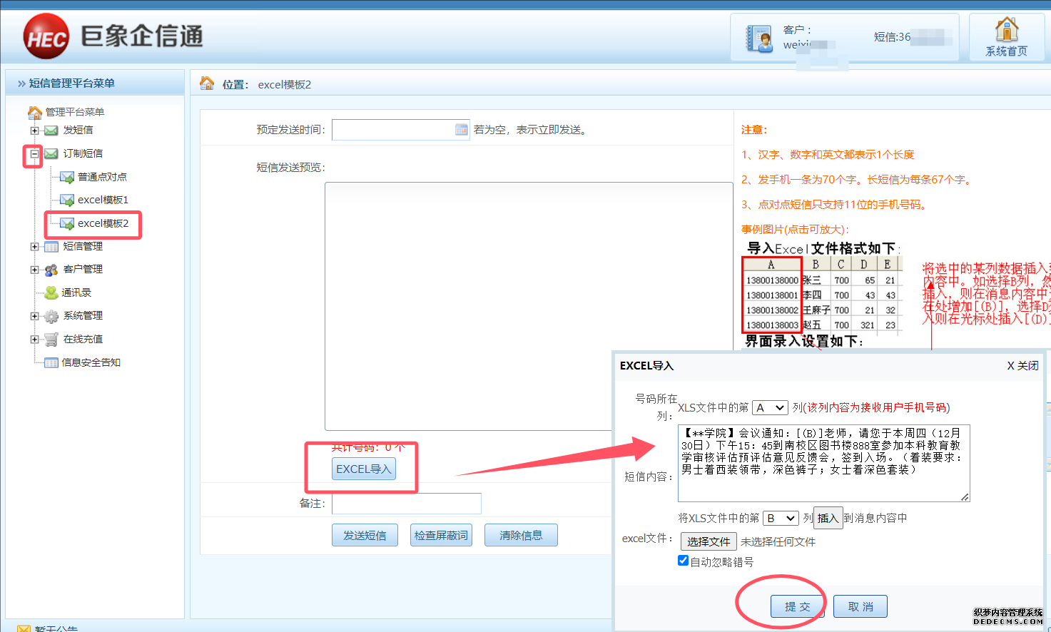 2、个性化变量会议通知短信一对一发送操作,即一个批次群发的手机号码收到的内容不完全一样,如内容里加入称呼、工资条、物业费、赛事编号、座位号、学号等。 首先点击左侧导航条的订制短信,如下图所示。有三种个性化变量短信提交方法,可根据您自身资料格式选择其中一种。