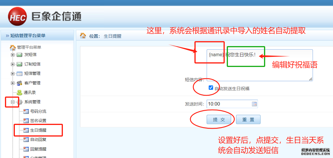 3、自动定时给员工、客户发生日祝福短信操作 首先点击左侧导航条的通讯录,导入含有生日日期的资料,然后点击系统管理下的生日提醒,如下图所示输入生日祝福语后点提交即可;到生日当天系统会自动发送生日祝福短信。